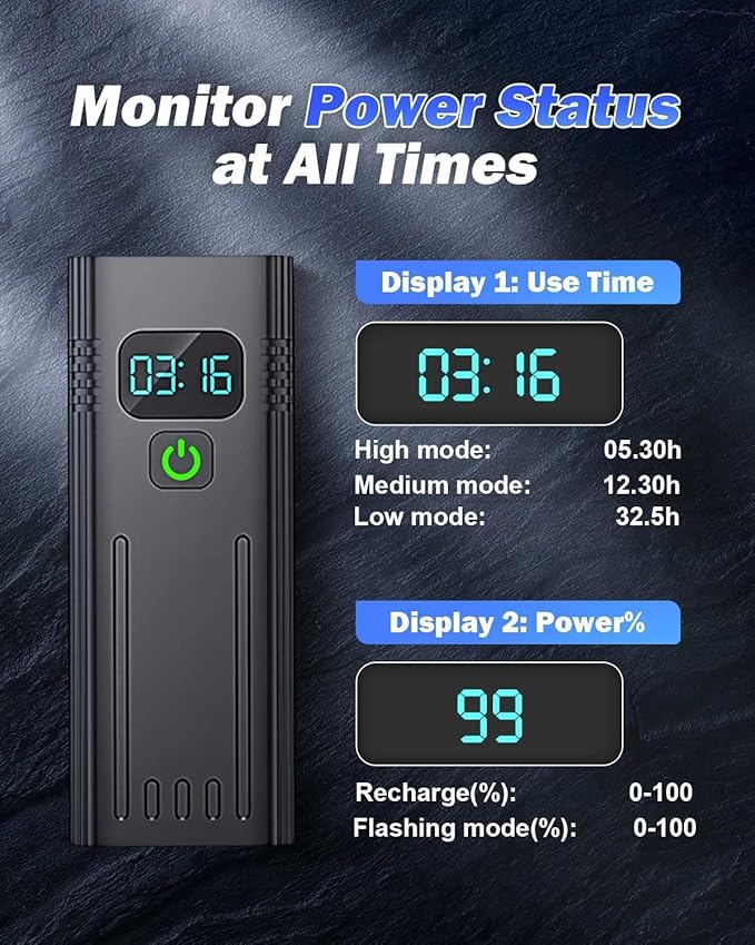 - [ POWER DISPLAY & LARGE BATTERY CAPACITY ] Equipped with a LED digital screen, our bicycle light can show you how much power remaining exactly and clearly. Will not get confused by the last power any more. Adopting with 10,000 mAh large capacity battery, once fully charge, our bicycle lights can work for 5 hours under strong mode!