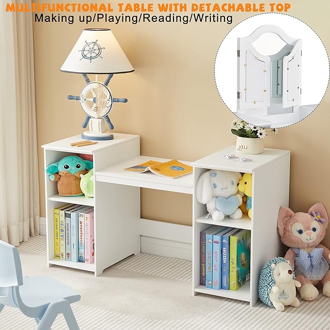 - 【Large Storage Space】 The spacious desktop is convenient for kids to makeup, write or read. The four large-capacity compartments below provide your little one with additional space to place their cosmetics, toys, books and other personal items. This unique design helps to cultivate their good finishing habits.