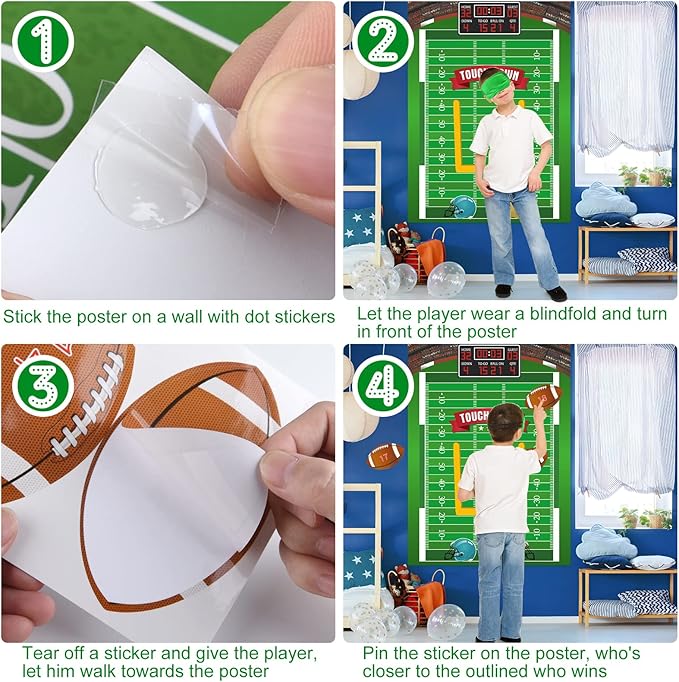 - Football birthday party game set: 1 × large football game poster, 1 × football game card, 24 × football stickers, 1 × blindfold, 1 sheet self-adhesive dot. Classroom family activities, kids birthday party games, football party favors sports event decorations