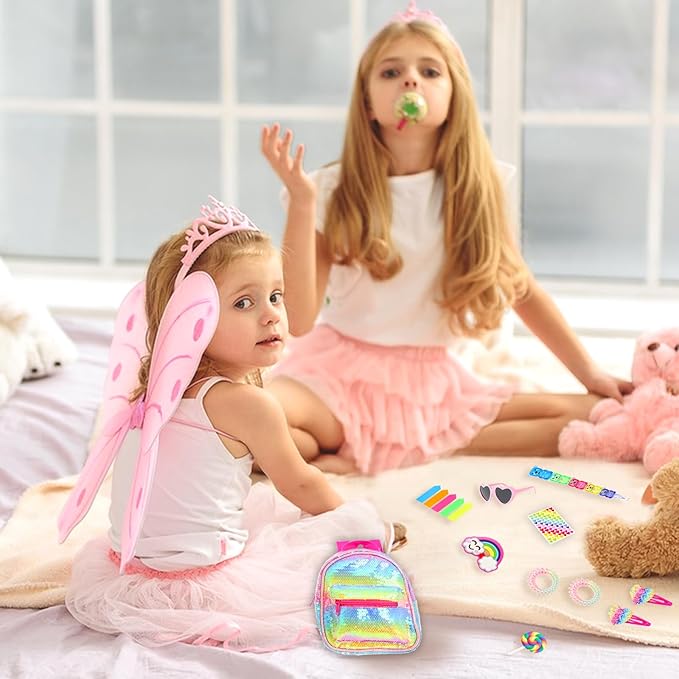 - Package includes:1 rainbow dress, 1 backpack, 1 sunglasses, 1 sticker, 1 lollipop, 3 hair accessories and 6 school supplies items. DOLL IS NOT INCLUDED.