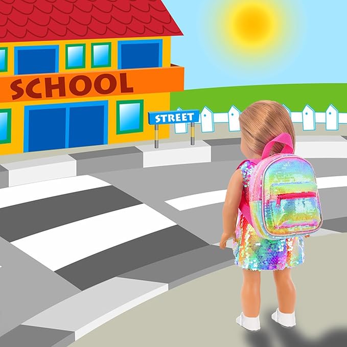 - The cute 18 inch girl doll backpack is special design with rainbow color of sequins, about 5.9" long and 4.7" wide, compact and portable. It can help children to store some doll clothes and accessories. Realistic and interesting doll bag will bring a lot of fun and happiness to your girls.