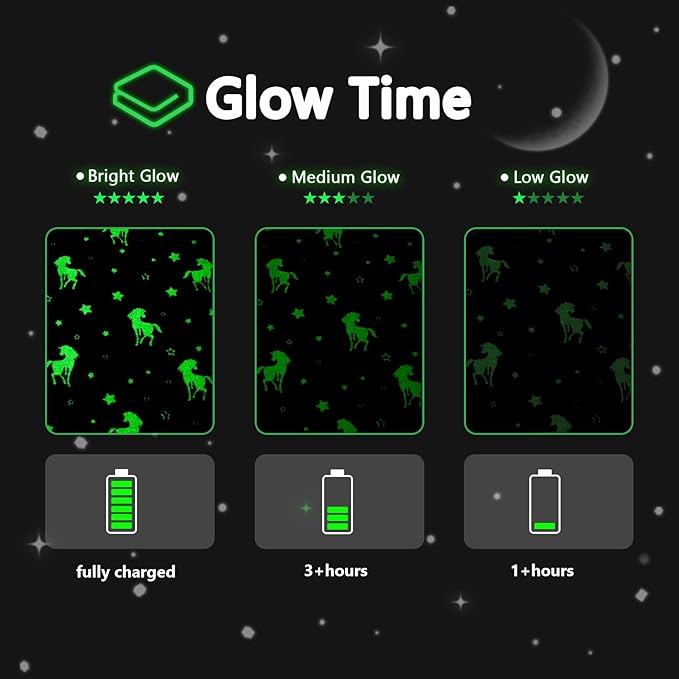 - Glow in the Dark Blanket:QSTEHEML kids blanket is designed to illuminate in the dark, adding a magical touch to any room. Simply expose the soft, ultra-fine fiber blanket to a light source for a few hours, and it will glow brightly in the dark. The brighter the light is, the stronger the Unicorns blanket glow in the dark. It is recommended that unicorns throw blanket is left under a bright light source or natural light for a few hours before use.