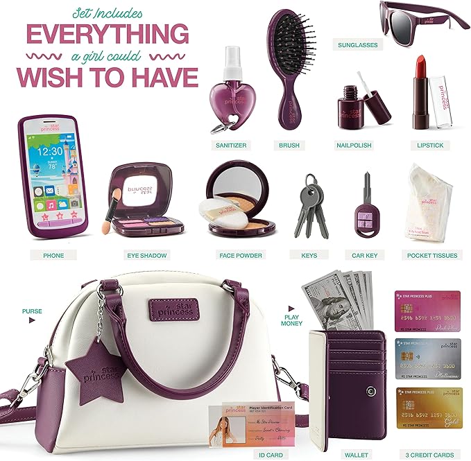 - SET INCLUDES - 1 purse, 1 wallet, 15-piece play money, 3 credit cards, 1 ID card, 1 cellphone (no function or batteries to ensure safe and long-lasting play), 1 car key fob, key ring with 4 keys, 1 hairbrush, sunglasses, pretend makeup set, looks so real but without the mess and does not apply to the skin (1 nail polish, 1 blush with applicator, 1 lipstick, 1 4-shades eyeshadow), 1 pack of real pocket tissues for pretend play and actual use, 1 hand sanitizer keychain bottle.
