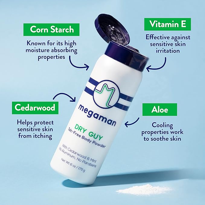 Megaman Sweat Absorbing Body Powder - Dry Guy | Prevents Chafing & Odor | Groin, Body, Feet & More | Talc-Free, All Natural | 6 oz