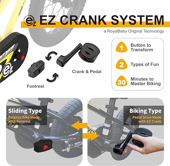 - HASSLE-FREE ASSEMBLY. Comes 98% Pre-Assembled. The patent cranks and footrest feature a tool-less quick release design. With one button click, the EZ bike can switch between a balance bike and a pedal bike.