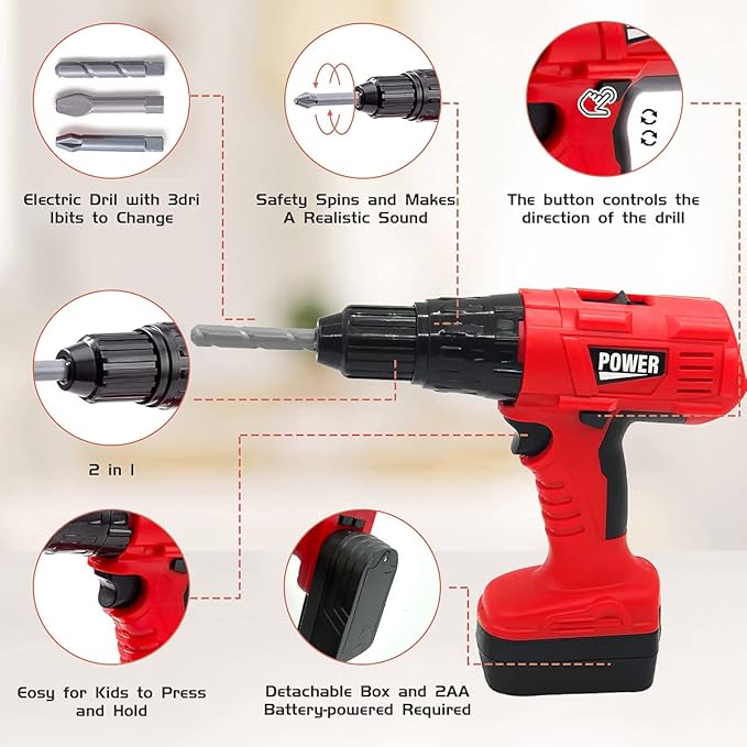 - 🔨【Electric Drill Toys Set】The drill comes with 3 interchangeable bits that kids can easily replace as needed; the battery powered drill rotates clockwise/counterclockwise and comes with realistic sounds, the drill's detachable battery pack makes it even more realistic for your More fun and great learning tools for kids.
