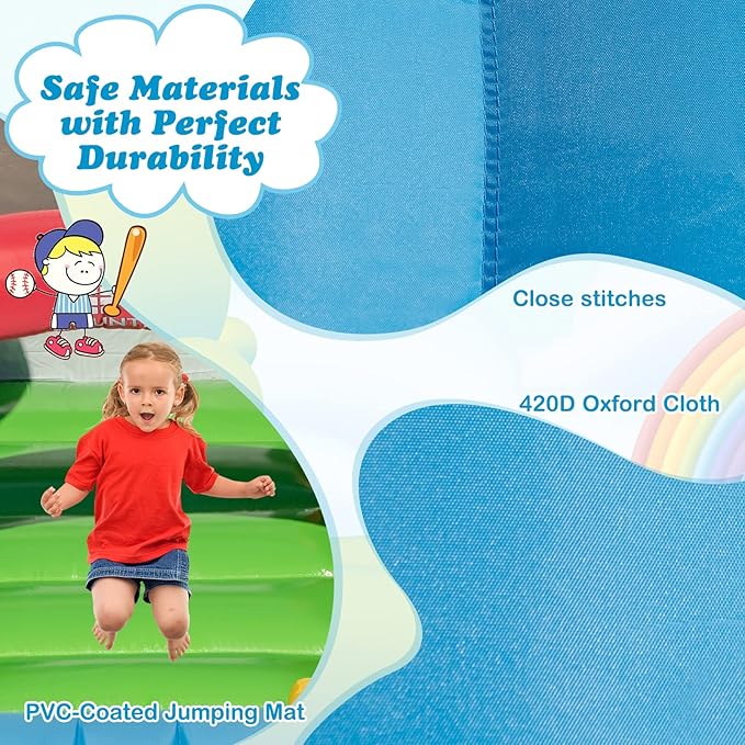 - 【Durable & Extra Thick Material】 Our inflatable bounce house is made of heavy-duty puncture proof and wear resistant 420D Extra Thick Oxford to ensure the safety of the kids, while the bouncing area adopting extra thick PVC-coated Oxford to strengthen its ultimate durability. With durable sewn and extra thick material, the jumping castle could accommodate multiple kids to play together. The jumping area is surrounded by ventilative netting to give your kids protection.