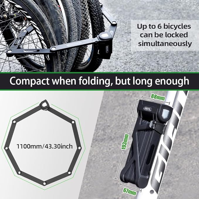 - 【Multi-purpose】: RBRL folding bike lock is 110cm long, can be used for bicycles, electric bikes, scooters and motorcycles. This alloy structure steel bike lock is also perfect for locking up items around the house, the garage, the construction site or the farm, like generator, gates & fences, grills & lawnmowers, sports equipment, tool boxes & ladders, stroller and many more
