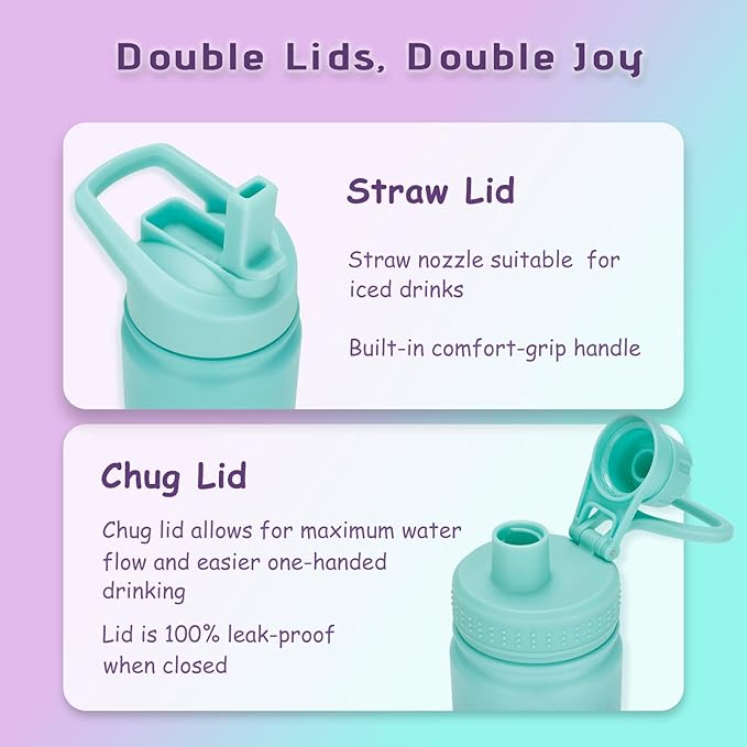 - 2 LEAK-PROOF LIDS: Stainless steel water bottle kids come with a BPA-free Straw Lid and Chug Lid, Offers a tight seal to prevent spills and leaks; So your kids won’t have to worry about pulling out soggy art projects or last-minute homework,2 lids can be switched at any time, Matching of different colors to suit different occasions