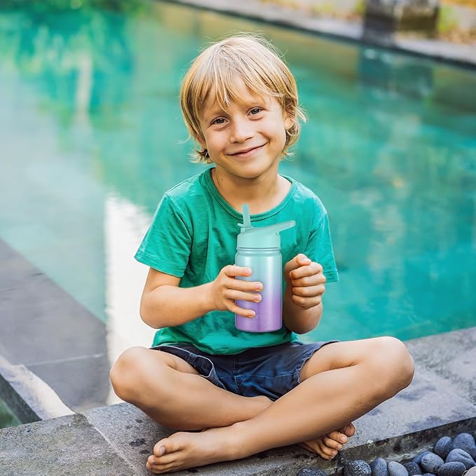 Mininoo Insulated Kids Water Bottle, 12 oz Stainless Steel Water Bottle Kids with Straw Lid and Chug Lid for Girls, Boys (Aurora)