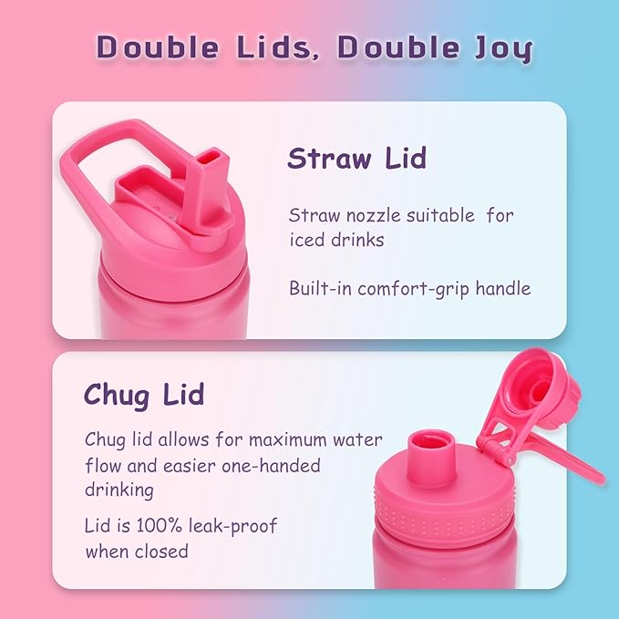 - 2 LEAK-PROOF LIDS: Stainless steel water bottle kids come with a BPA-free Straw Lid and Chug Lid, Offers a tight seal to prevent spills and leaks; So your kids won’t have to worry about pulling out soggy art projects or last-minute homework,2 lids can be switched at any time, Matching of different colors to suit different occasions