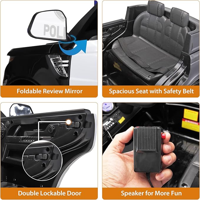 - 🚓【Two Modes to Operate】Kids can operate this big police car through pedal and steering wheel to enjoy the 2 different speeds. Parents can use 2.4GHz remote control which has three speed to guide kids' safely. Ideal for toddlers aged 3-6 years with a maximum weight capacity of 66 lbs. ASTM-certified to this electric vehicle