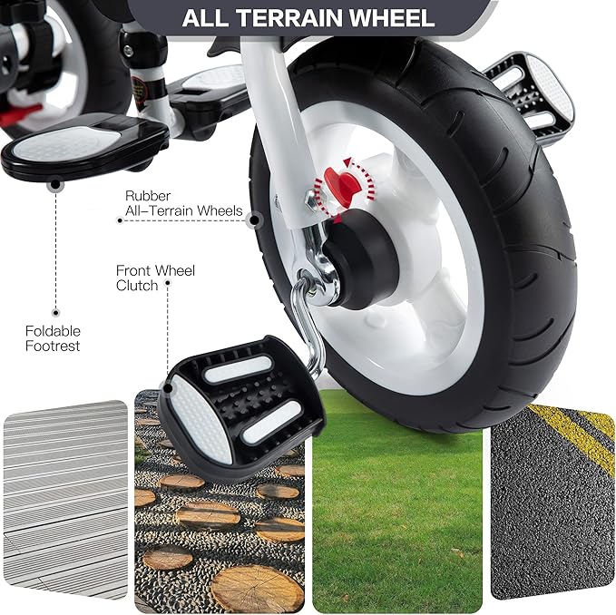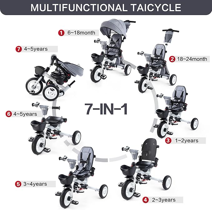 - 【7 in 1 Tricycle】:JMMD baby trike can meet the needs of your children at different ages from 18 months to 5 years. This kids stroller tricycle can be used in 6 modes by removing the accessories, including toddler trike, steering trike, learn-to-ride trike, classic trike, seat 360-degree rotate and fold mode