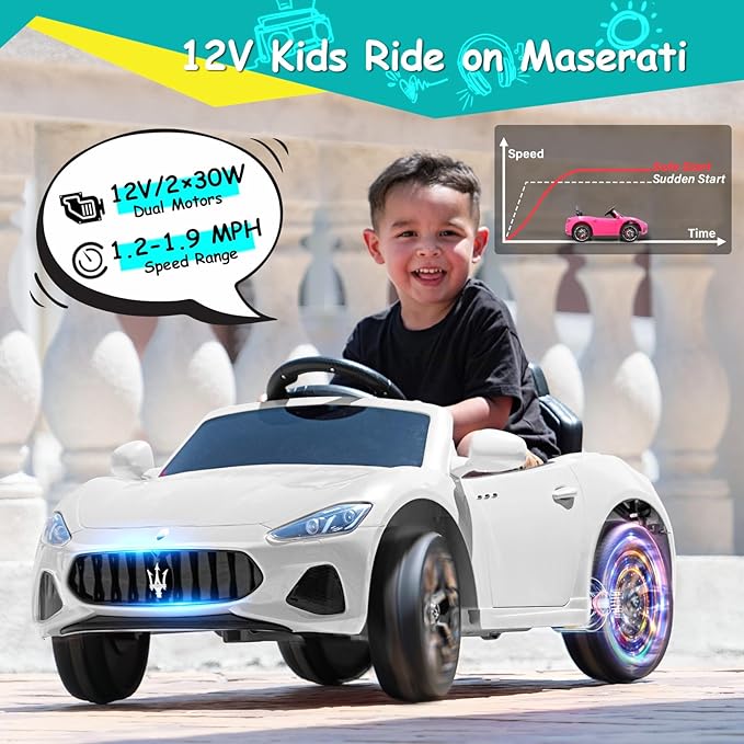 - 12V Realistic Driving Experience: Joywhale 12V Kids Ride on Licensed Maserati has almost restored the real car's appearance to give 3-6 years little kids a realistic driving experience, and equipped with 12V dual motors power configuration, which can provide stable current on various terrains.