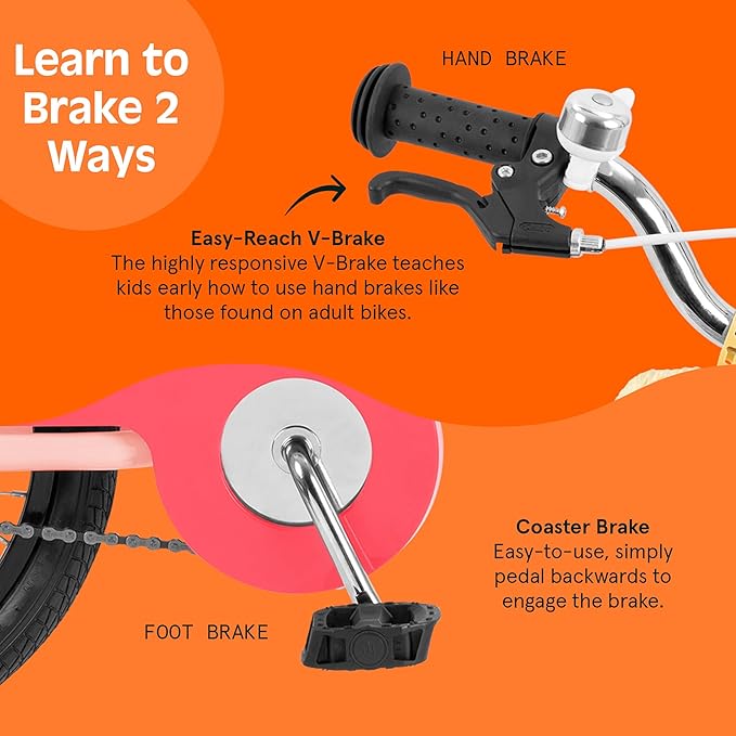 - REACH ADJUSTABLE V-BRAKE: Responsive, easy-to-use, and helps them learn early how to brake effectively using the same type of hand brake seen on adult bikes. Easily adjust the brake lever’s reach to fit smaller hands.