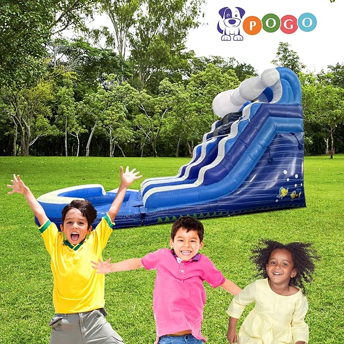 - PREMIUM INFLATABLE WATER SLIDE: Skip the long lines at the park & enjoy endless water fun with our large slide & shallow splash pool! Ideal for backyard playtime. Kids will have a blast without leaving home. This commercial water slide is versatile and can be used wet or dry for equal amounts of fun!