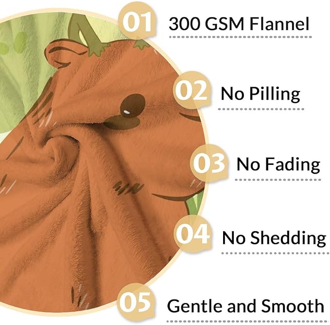 - Soft Comfortable Blanket Material: Our throw blanket made of soft flannel material. This plush capybara throw blanket is cozy fuzzy soft, durable, warm and lightweight. Neat stitches and printed with vibrant colors. The cozy throw blanket is wrinkle and fade resistant, doesn't shed, suitable for all seasons.
