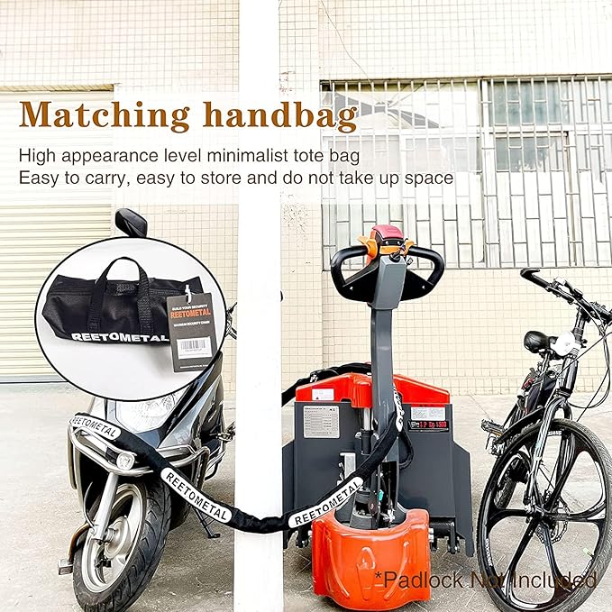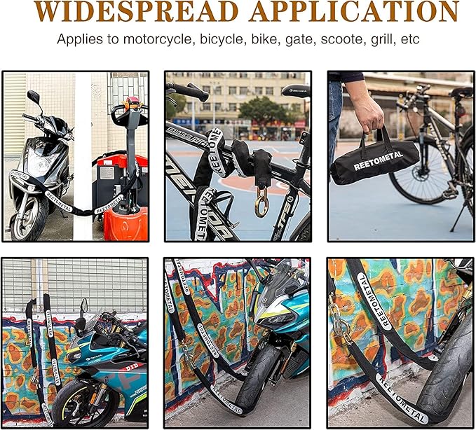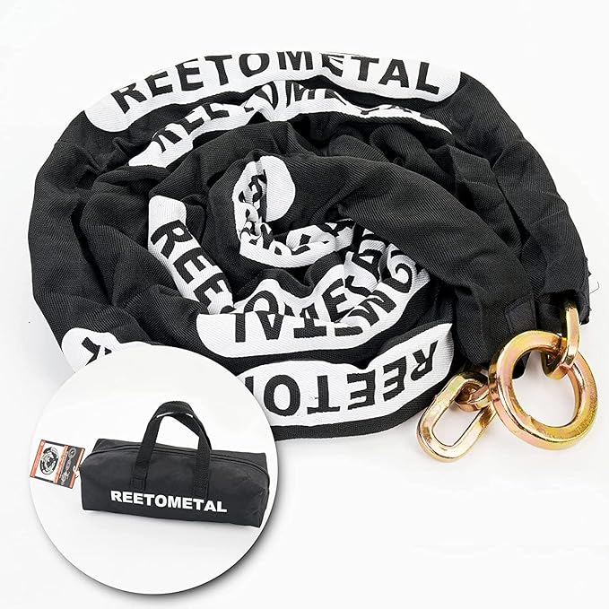 - ANTI-CORROSION & SCRATCH-RESISTANT DESIGN: Featuring a special anti-corrosion coating, the Reetometal security chain is built to resist rust and weathering, ensuring long-lasting performance in all conditions. The nylon sleeve protects your property from scratches and damage during use, while the included chain bag makes it easy to carry and store the chain when not in use. Perfect for both indoor and outdoor applications.