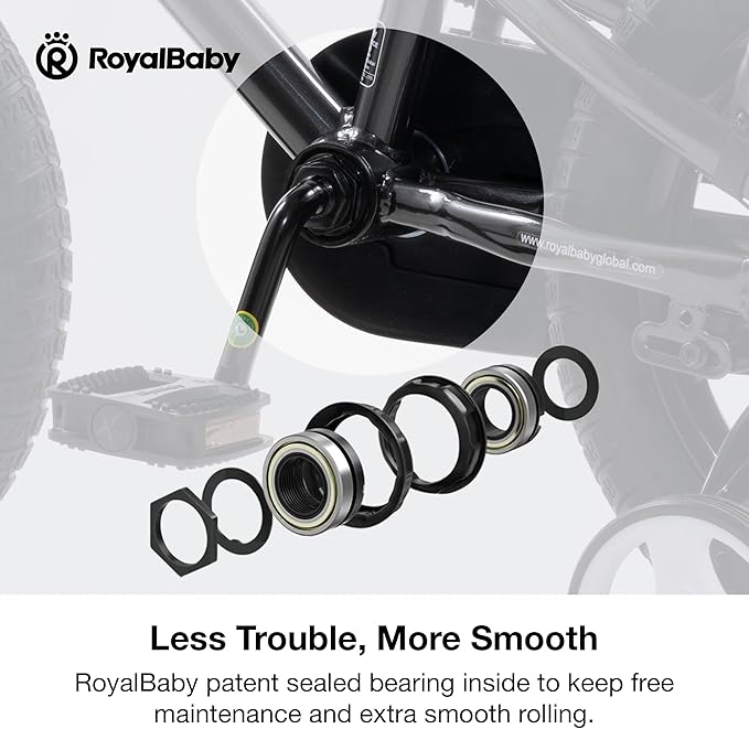 - ๐ฆ๐ฝ๐ฒ๐ฐ๐ถ๐ณ๐ถ๐ฐ๐ฎ๐น๐น๐ ๐๐ผ๐ฟ ๐๐ถ๐ฑ๐. Each bike equipped with RoyalBaby patent sealed bearing for smooth pedaling. Training wheels come with 12, 14, 16 inch bikes, making it easy to maintain balance and learn to pedal for young beginners. The BPA free water bottle adds more joy to the ride. Fully adjustable seat and handlebar will give extra space when kids grow taller