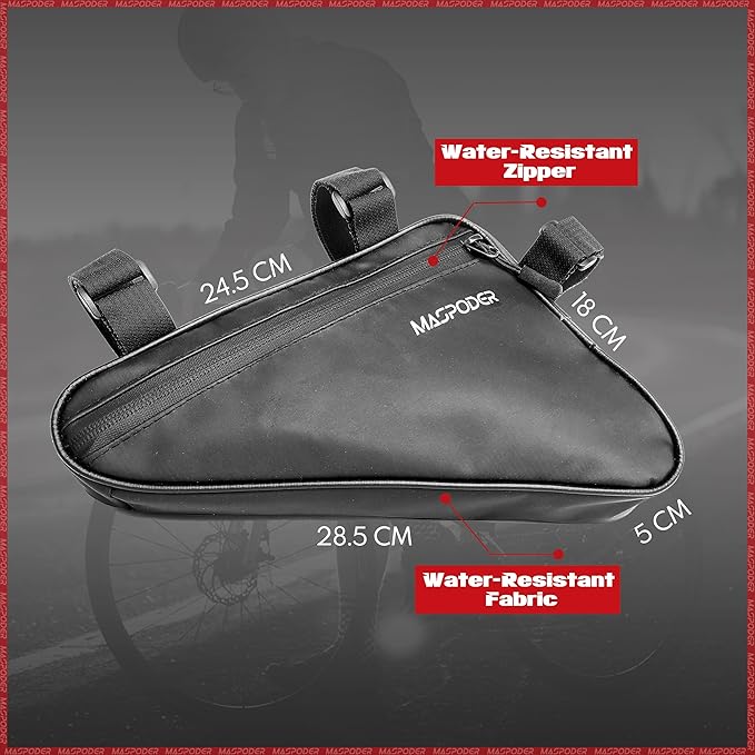 - Well made bike frame bag. With a capacity of 1.1L, the bike bag easily stores your emergency repair tools and personal items. Made from PVC water resistant fabric, this bike bag provides excellent tear resistance and is highly durable, not to mention water resistant in light rain. The bicycle bag also features a reflective design, enhancing safety during night rides. Plus, this bike repair kit comes with a mini tool box to keep your tools organized and tidy
