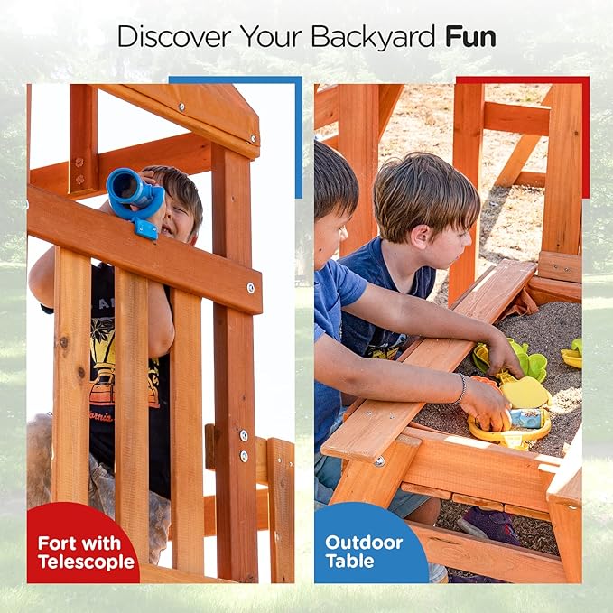 - MULTIPLE FUN: Our swing set contains monkey bar, 2-in-1 outdoor table, 6FT wave slide, 2 belt swings, climbing wall and fort with telescope; multiple combination parts allow children to enjoy the fun of the playground
