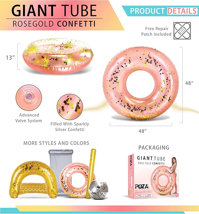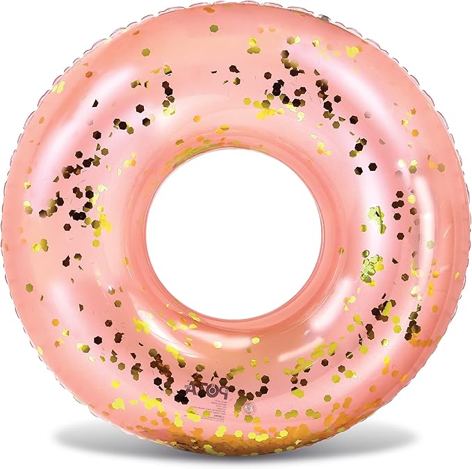 - HIGH-QUALITY POOL TUBES FOR KIDS, TEENS, AND ADULTS - Rose Gold Confetti Pool Float Tube is a heavy-duty inner tube for pool made of premium quality PVC vinyl materials. Crafted with UV and tear resistance to protect the glitter tube pool float from color fading or cracking. Designed with eye-catchy colors and mix--shaped sparkling confetti inside the kids swim ring. Use the large round pool float at the beach, swimming pool, river or lake.