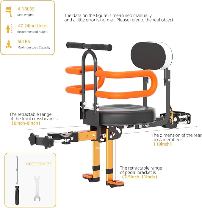 - 【Easy to Carry and Install】The front mount toddler bike seat is foldable and retractable, The pedals can be adjusted to the right height according to the child's height.so you can easily fold or store it anywhere.It also comes with a set of installation tools and installation instructions, making installation simple and quick.