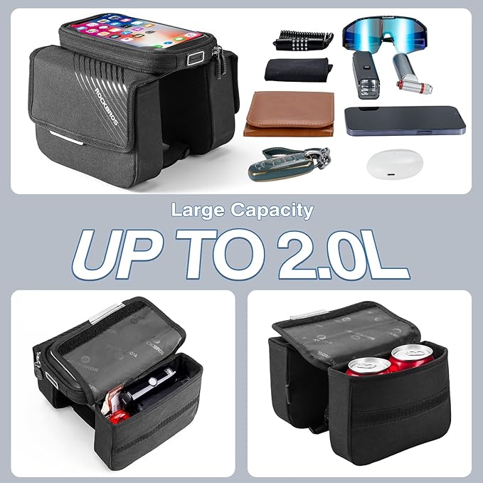 - 【EASY TO INSTALL& QUICK RELEASE】ROCKBROS bike phone frame bag quick-release mounting system of the bag that allows fast, easy mounting and removing.3 straps are firm enough to hold up on the bike, the bicycle bag would not move around even if you ride on a bumpy or rocky road