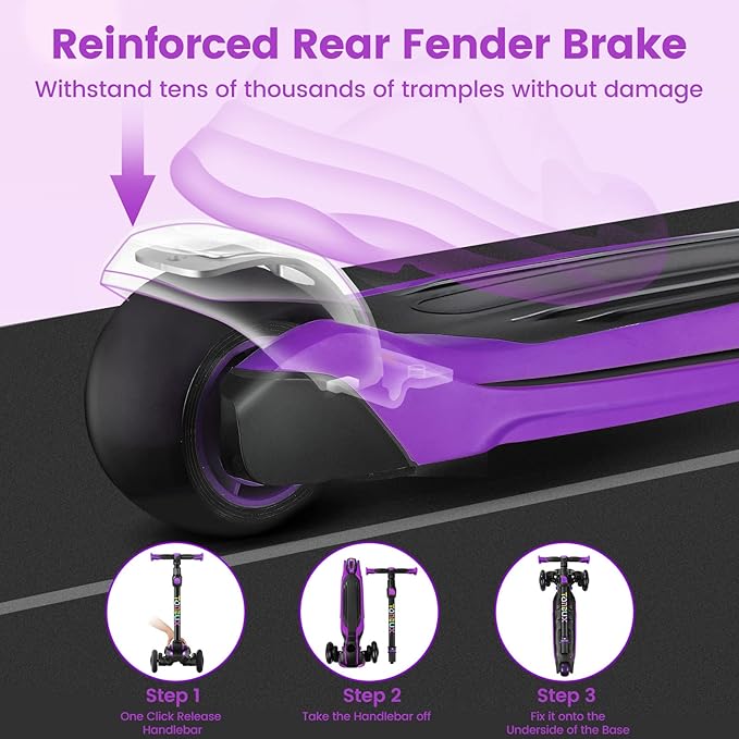 - 【Safety & Sturdy】The progressive braking system prevents the scooter from rolling over due to sudden braking. TPR sweat-wicking handle can keep children's hands fresh and not sticky. Aluminum alloy reinforced frame, High-strength structural pedals and 5.11'' SUV-level widened pedals makes the actual bear weight is 110 lbs higher than similar products, supports up to 220 lbs. The built-in stable triangular structure prevents rollover, bringing your kids a smooth and safe ride experience.