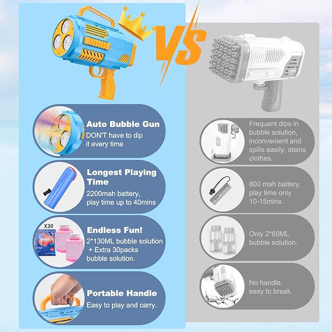 - 【EASY TO USE】: Just one-click,bubble blower can blow thousands of bubbles at the same time, our large battery capacity make the playing time up to 60+mins, avoid the battery run out just playing 10 minutes. Bubble gun size is 10.9*5.1*9.5Inch,perfect size for kids playing.Perfect toys for 4 5 6 7 8 9 10 year old boys/girls. Start your bubble journey!