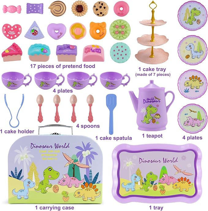 - 【Super Value Pack】Our dinosaurs tea set includes 1 teapot, 1 cake shovel, 1 cake tongs, 4 cups, 4 medium-sized plates, 4 small-sized plates, 4 spoons, 1 big plate, 1 cake tray (made of 7 pieces)17 pretend tea dessert accessories and a dinosaurs carry case. Easy to carrying.