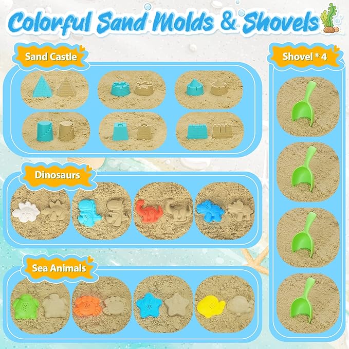 - All-in-One Collapsible Beach Bucket Set --- including everything for kids to play a beach game, you will receive foldable beach bucket * 4, shovel *4, mesh beach bag *2, sand castle mold *6, sea animal mold *4, dinosaur mold *4. This collapsible sand pails and beach toy set is for kids and toddlers age 3 4 5 6 7 8 9 10 & 10+