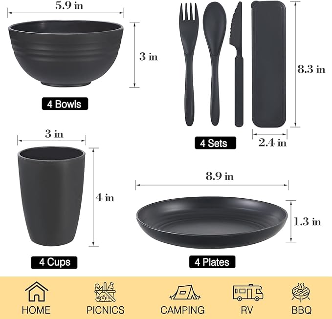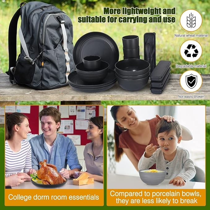 - High Quality: The 28pcs dinnerware set is made of unbreakable natural wheat straw fiber and food grade PP material. This very healthy tableware set is dishwasher, microwavable and freezer safe.