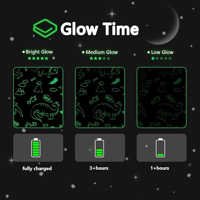 - Glow in the Dark Blanket:QSTEHEML dinosaur blanket for boys are designed to illuminate in the dark, adding a magical touch to any room. Simply expose the soft, ultra-fine fiber blanket to a light source for a few hours, and it will glow brightly in the dark. The brighter the light is, the stronger the blanket will glow in the dark. It is recommended that blankets are left under a bright light source or natural light for a few hours before use.