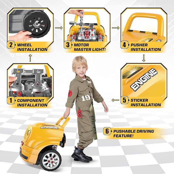 - Best Christmas Gift for Kids: This large-sized toy is an ideal gift for boys aged 3-8 years old, allowing them to experience being a mechanic. Packaged in an exquisite box and featuring a bright yellow color, it makes a perfect present for Christmas, Halloween, Thanksgiving Day, New Year, Easter, and birthdays. Children can have a real simulation of driving like adults, and their faces will radiate pride and confidence during their repair time.