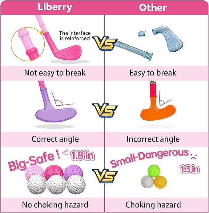 - SAFE AND DURABLE: The latest kids golf set is made of high-quality plastic, odorless and no sharp edges or burrs. the clubs have enhanced hardness and are not easily broken. Plus, our golf balls are larger (1.8 inches) to effectively avoid choking hazards