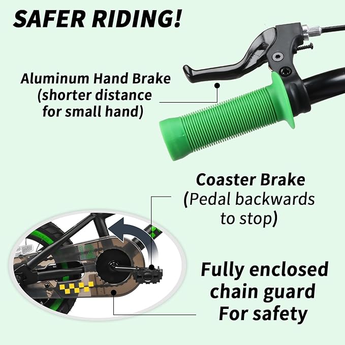 - 【Safety First】 Equipped with a hand brake and Coaster Brake, this toddler bike offers strong stopping power for young riders. The enclosed chain guard protects little hands from moving parts, ensuring worry-free rides.