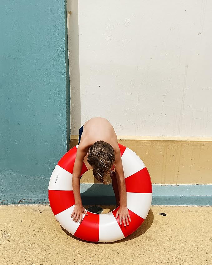 Petites-Pommes Water Tube for Kids - Durable Inner Tube, Handprinted Classic Striped Design Tire Pool Float, Soft Comfort Seaming, Packable Floats for Travel, Bright Red, 35 inch