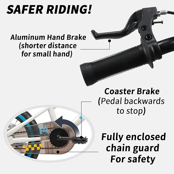 - 【Safety First】 Equipped with a hand brake and Coaster Brake, this toddler bike offers strong stopping power for young riders. The enclosed chain guard protects little hands from moving parts, ensuring worry-free rides.