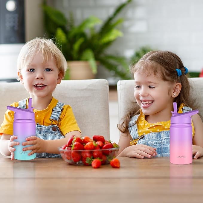 - COLORFUL & PRACTICAL:It’s important for kids to drink water to maintain adequate hydration and reduce consumption of sugar-sweetened beverages. Mininoo toddler water bottle with straw uses only food grade, BPA Free, recyclable materials for our insulated water bottles,This insulated water bottle for kids has a double wall design to keep drinks cold plus vacuum insulation and powder coating to keep it sweat-free and easy to grip