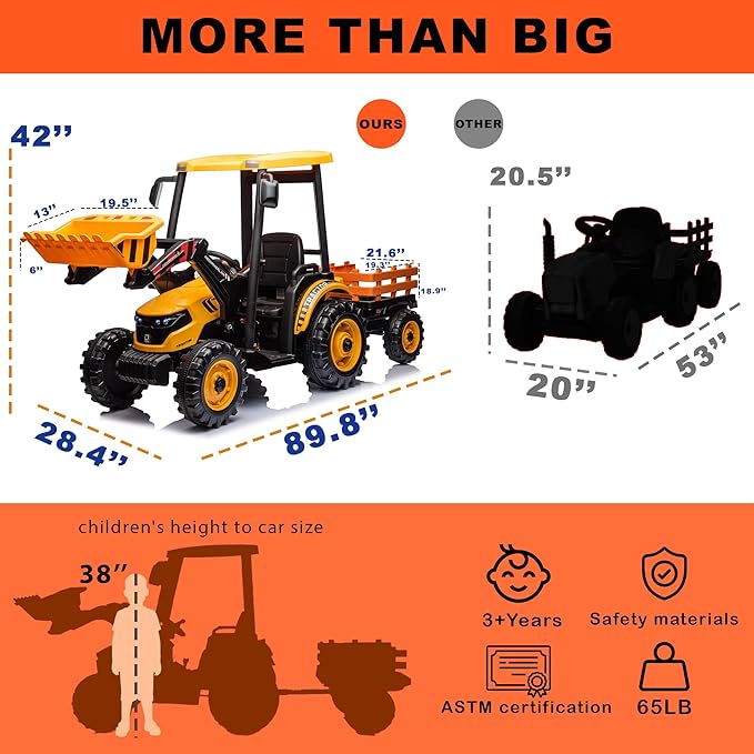 - 【24v Kids 3in1 Ride on Tractor with Remote Control】: 24V kids ride on tractor equipped with a front loader and a detachable trailer, kids can use the trailer to transfer small things, the trailer can be easily disassembled. And kids can easily operate the front loader, making scoops, lifts, carries and dumps from the driver's seat, it can be a kids ride on excavator. Through riding this 24 volt ride on tractor, children can clean the garden with their parents and enjoy the happy parent-child time.