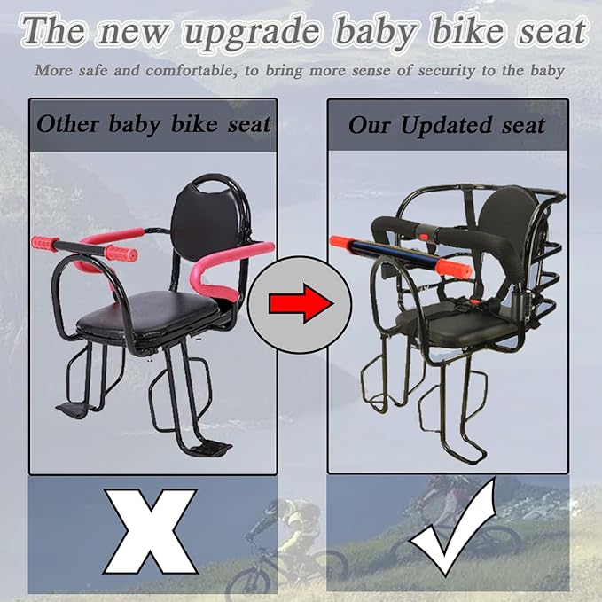 - 【Removable Handrail & High quality materials】In order to adapt to children of different ages,this back child seat for bike guardrail and handle are removable at any time, which can adapt to children of different ages. made of steel, which is strong and durable. Thickened and waterproof seat cushion gives your child comfortable. The guardrail hand guard is made of breathable open-cell sponge material, which is breathable and non-slip. High quality materials which not only makes it super sol