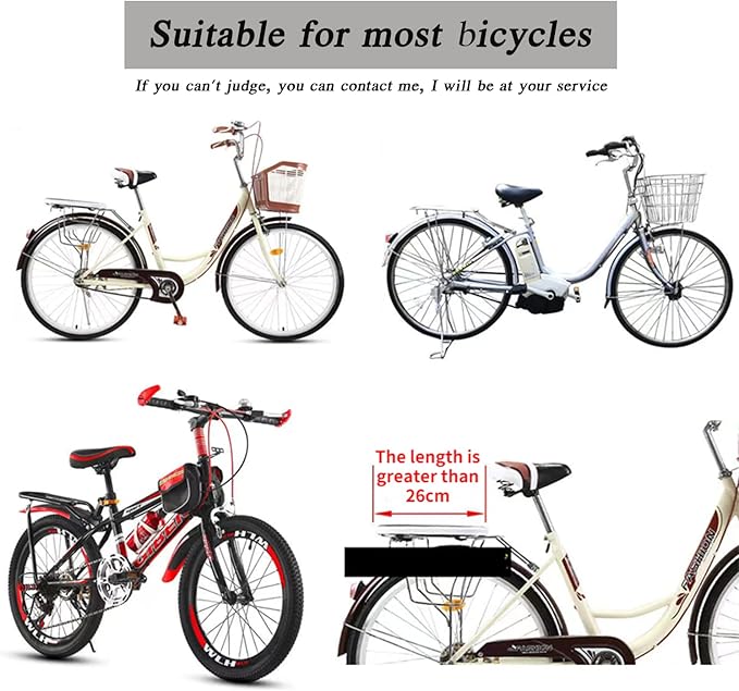 - 【Matters needing Attention】The length of the bicycle rear frame must be greater than 10.23 inches, and the width must be less than 7.87 inches. So It suitable for all types of bikes with a rear rack, such as mountain bikes,If you can't judge whether the model is compatible, you can contact me, I will be at your service at any time.