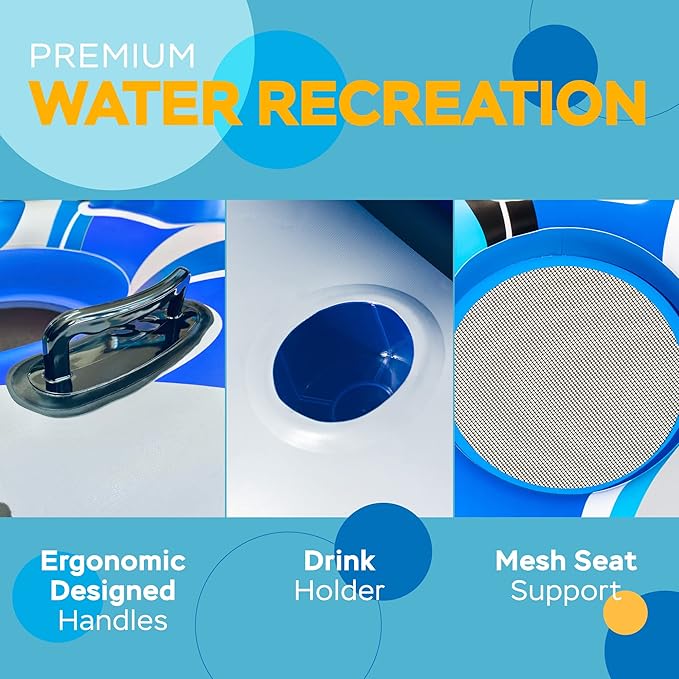 - 【FANTASTIC FEATURES】: The River Blazer comes with two heavy-duty grip handles for maximum control; the built-in drink holder conveniently keeps your refreshment nearby; the grab rope can be used to anchor with other floats; the double-stitched mesh bottom encourages airflow to keep your body cool (air pump not included)