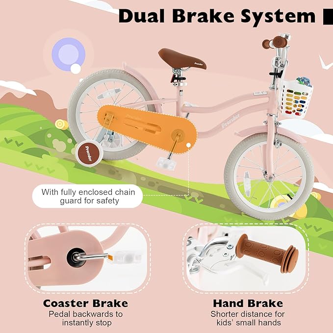 - [ Safe Dual Brake & Sealed Bearing ]: Our children training bicycle is equipped with hand brake (shorter distance design for kids’ small hands) and coaster brake ( pedal backwards to instantly stop). Besides, with fully enclosed chain guard for safety, the toddler bike improves kids’ riding security to a higher level.