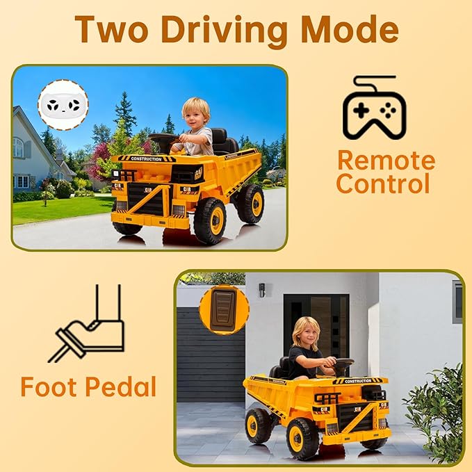 - TWO DRIVING MODES- AOKOY ride on construction truck comes with a 2.4G remote control. Kids can independently drive the 12V battery powered car by themselves with electric foot pedal and steering wheel. Also parents can OVERRIDE kids’ control by the radio controller, to avoid potential danger.