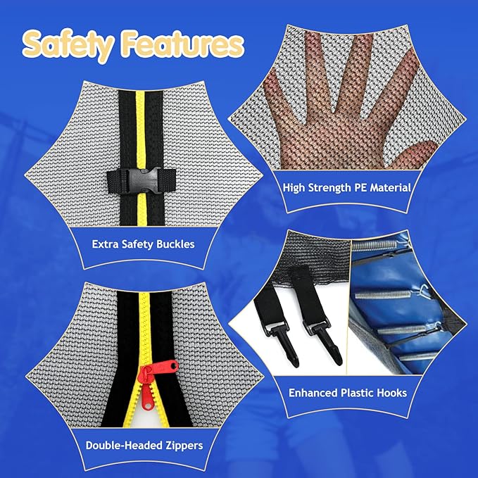• 【Easy Access with Safety】Featuring a double-side zipper, this trampoline can be close or open from both outside and inside. The protective buckle avoids the risk of zipping by accident.