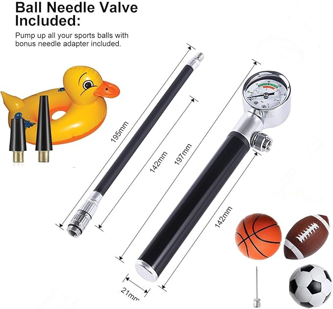 - ☆ SMALL HAND PUSH PUMP. The tire pressure can reach 210 PSI, accurate to 2.5,comes with a compact pump with both Schrader and Presta valve attachment , a ball adaptor and 2 air nozzles for swim rings balls and other inflatables. detail (The valve can be switched by unscrewing at the hose (S) & (P) mark).