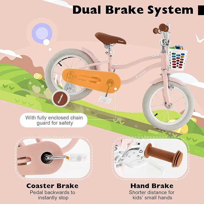 - [ Safe Dual Brake & Sealed Bearing ]: Our children training bicycle is equipped with hand brake (shorter distance design for kids’ small hands) and coaster brake ( pedal backwards to instantly stop). Besides, with fully enclosed chain guard for safety, the toddler bike improves kids’ riding security to a higher level.