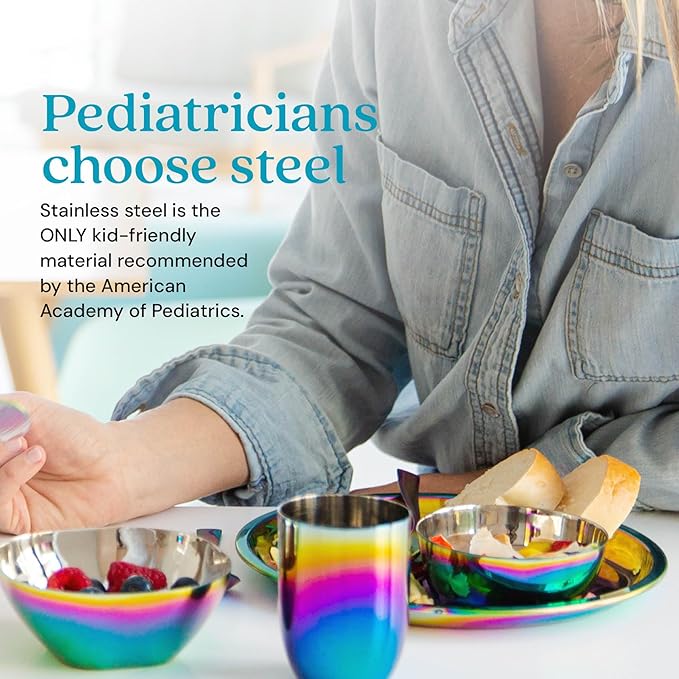 - FUN BONDED COLOR: Each rainbow stainless steel kids plate features a safe titanium PVD finish — never paint or harmful coatings — for brilliant, fade-resistant color. This process bonds the hue directly to the metal, creating durable, easy to clean kids stainless steel plates that look beautiful for years.